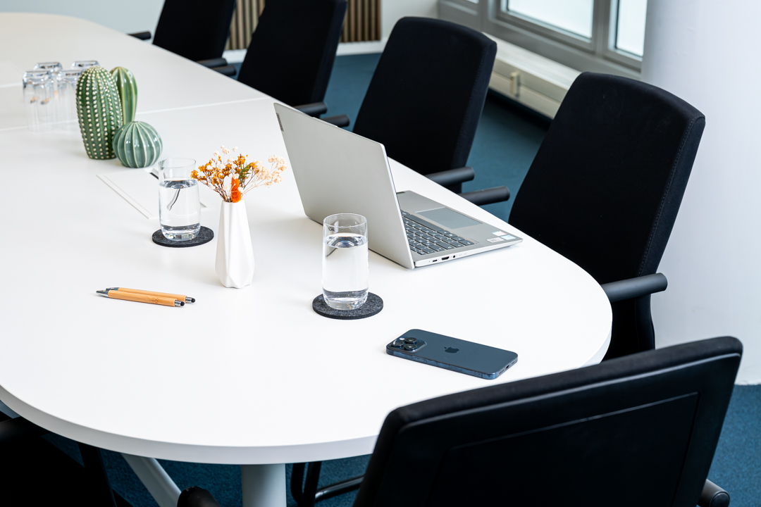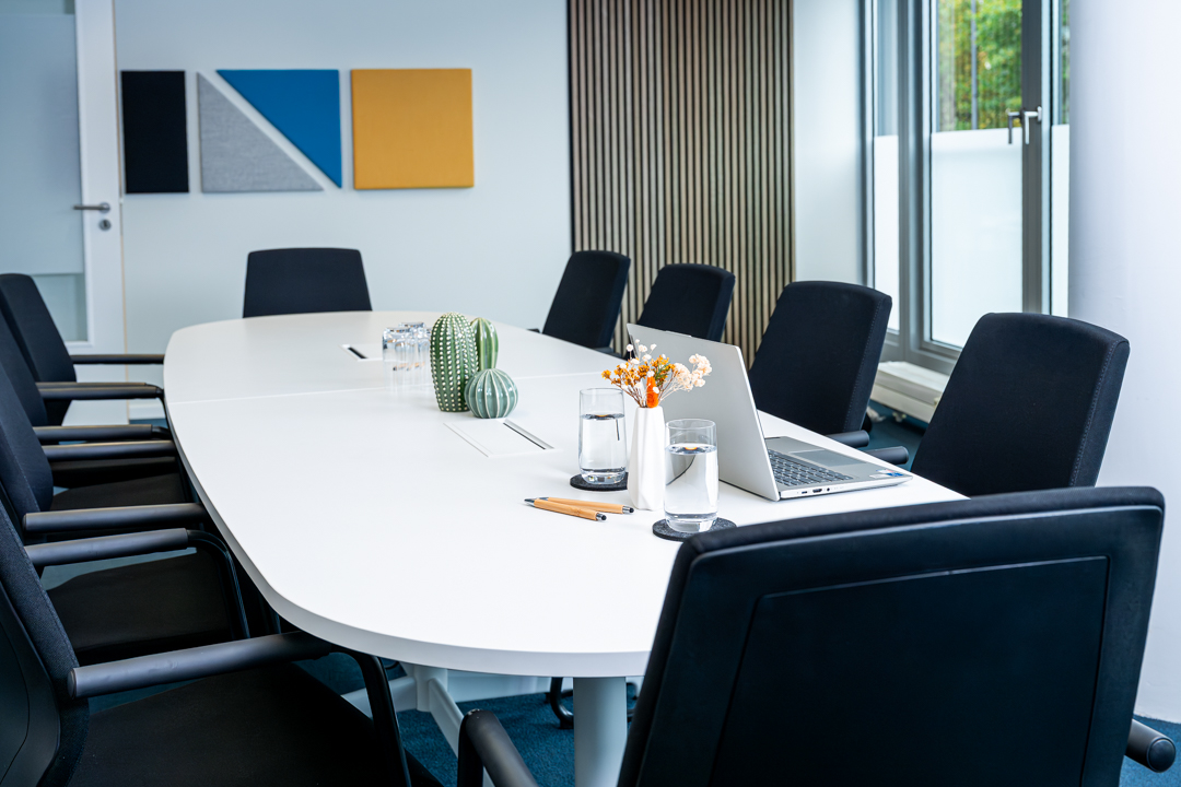Wireless LAN, printer, projector & screen, flipchart, moderation kit. The large meeting room also features an AI webcam for live conferences.